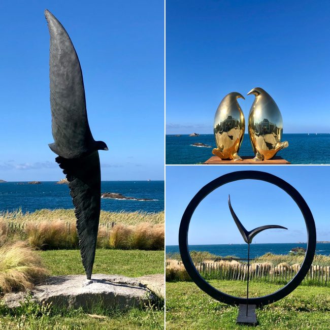 Monumentales face à la mer Exposition @ Thalassa Dinard Les oiseaux d’Isabelle Thiltgès face à la mer … Un projet concrétisé avec l’arrivée de Prélude (H. 3,50m), La Grande Envolée (H. 2,50m) et Les Pingouins dorés XL (Golden Penguins XL) (H. 90cm) dans les jardins du Thalassa Dinard. Trois sculptures monumentales librement installées au bord de la falaise…