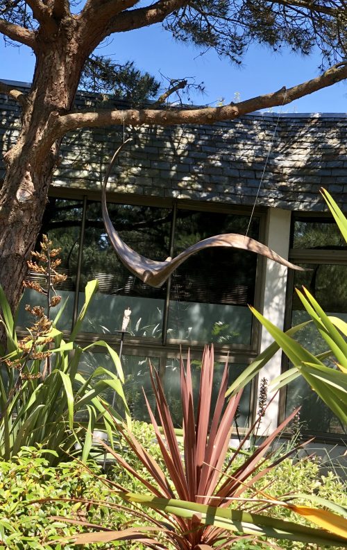 Côté jardin, place à L’Instant, rencontre renouvelée au gré du vent entre le personnage en bronze tendu vers le grand oiseau suspendu ailes déployées (envergure 1,50m).