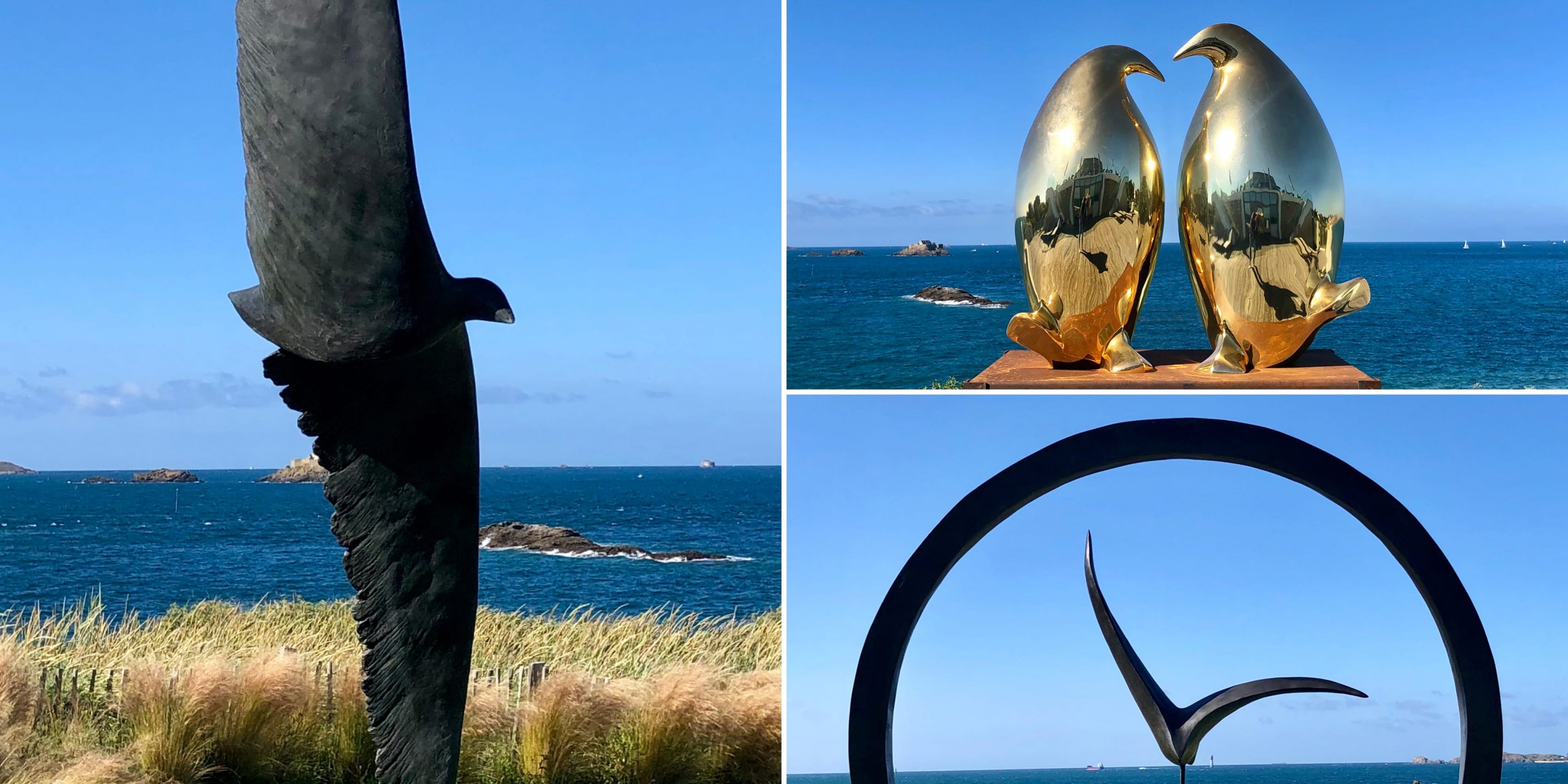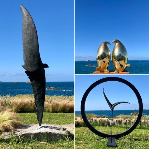 Les oiseaux d’Isabelle Thiltgès face à la mer … Un projet concrétisé avec l’arrivée de Prélude (H. 3,50m), La Grande Envolée (H. 2,50m) et Les Pingouins dorés XL (Golden Penguins XL) (H. 90cm) dans les jardins du Thalassa Dinard. Trois sculptures monumentales librement installées au bord de la falaise jusqu’au 15 novembre prochain.