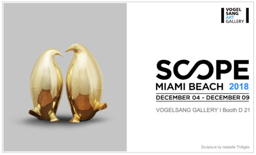 Nouveau voyage outre-Atlantique pour le Couple de Pingouins dorés XL (Golden Penguins XL) du sculpteur Isabelle Thiltgès exposé cette année encore par la Vogelsang Gallery à la SCOPE Art Show 2018 qui se déroule pendant Art Basel Week à Miami Beach.